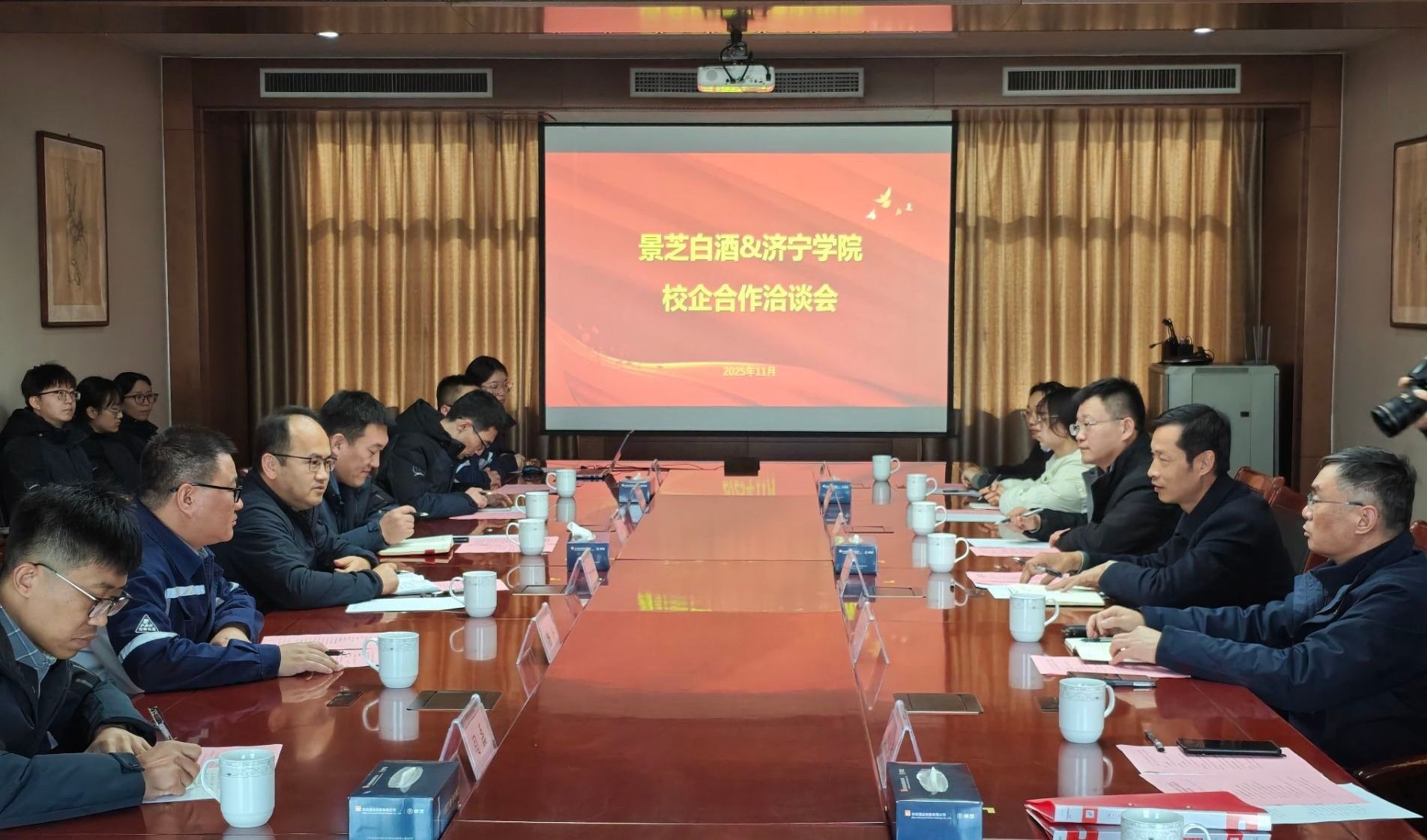 山东景芝白酒有限公司副总经理、生产中心总经理冯涛,人力资源总监杨安等企业领导对学院一行予以热情接待。活动伊始,双方共同观看了企业宣传片。刘忠建对公司的周到安排表示感谢,并就学院的专业设置、学科建设、人才培养及学生实习就业等情况作了详细介绍。冯涛围绕企业发展历程、产业布局、未来规划及员工培训机制等内容进行了全面介绍。