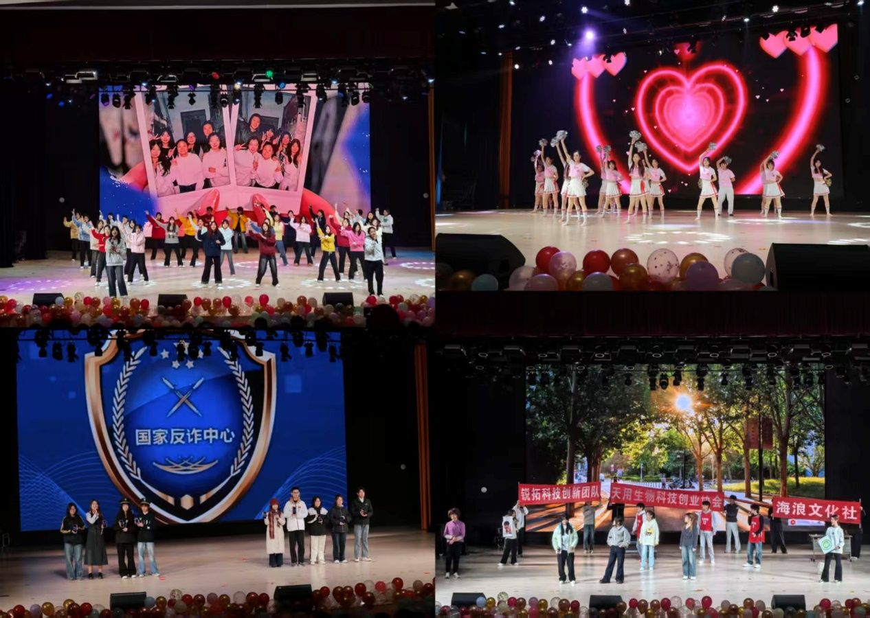 晚会在活力四射的拉拉队舞蹈《曙光》中热烈开场,瞬间点燃现场气氛。整场晚会节目形式多样、内容精彩纷呈:深情婉转的歌曲《路过人间》、豪迈激昂的《天下》,以及经典重现的唱跳《青苹果乐园》,充分展现了青年学子昂扬向上的精神风貌;小品《大学生生存指南》和《别让手机偷走时间》分别围绕反诈宣传与时间管理主题,以幽默诙谐的方式传递正能量;情景剧《社团招新啦》生动演绎校园生活片段,趣味横生;红色朗诵《以青春之名,赴时代之约》铿锵有力,表达了学子们坚定的理想信念与时代担当。