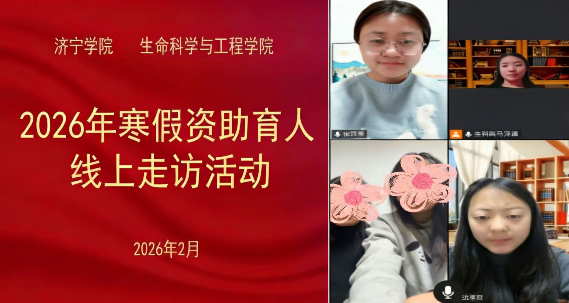 为进一步加强家校协同育人,提升资助工作的精准性与实效性,2月1日,生命科学与工程学院通过腾讯会议组织开展了“2026年寒假资助育人线上走访活动”。学院辅导员与学生家庭“云端”相见,传递温暖关怀,凝聚育人合力。