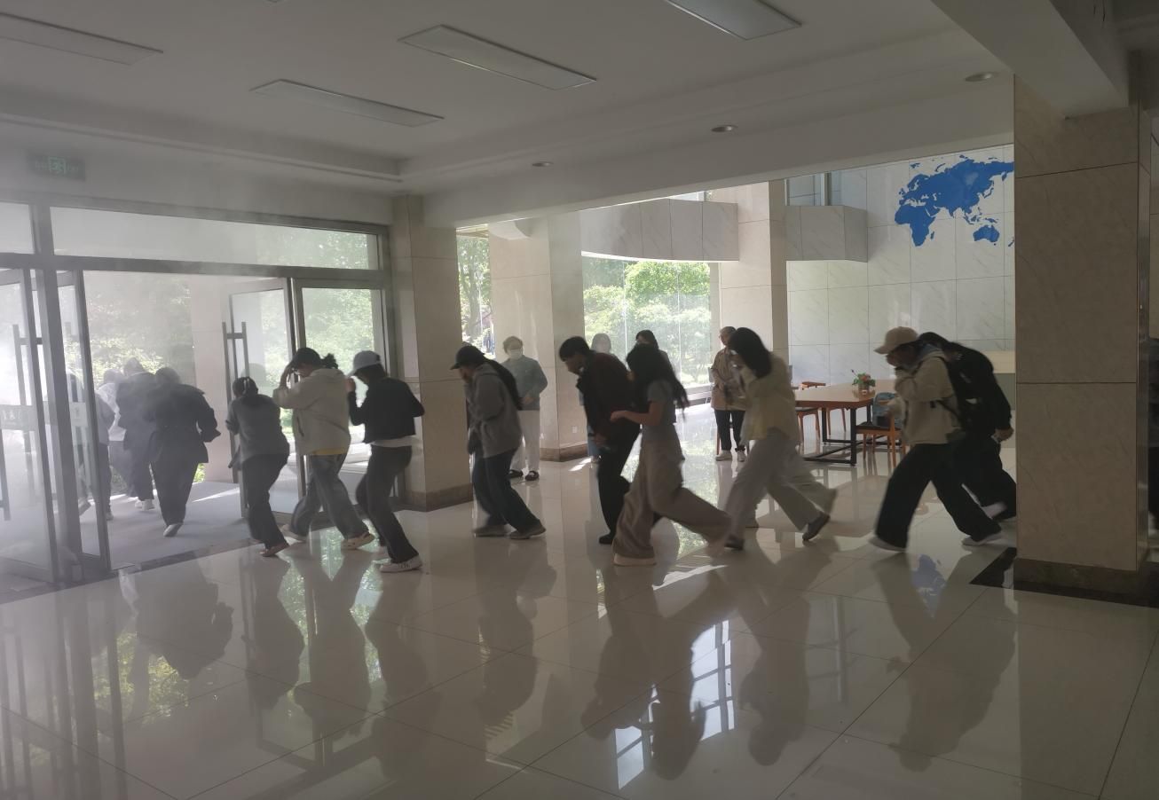 在模拟火场疏散逃生环节,现场利用专业发烟设备真实还原教学楼火情浓烟扩散场景。火情信号发出后,参演师生迅速反应,严格遵循消防逃生规范,捂住口鼻、弯腰低姿,沿预定路线快速有序撤离,圆满完成紧急疏散任务。