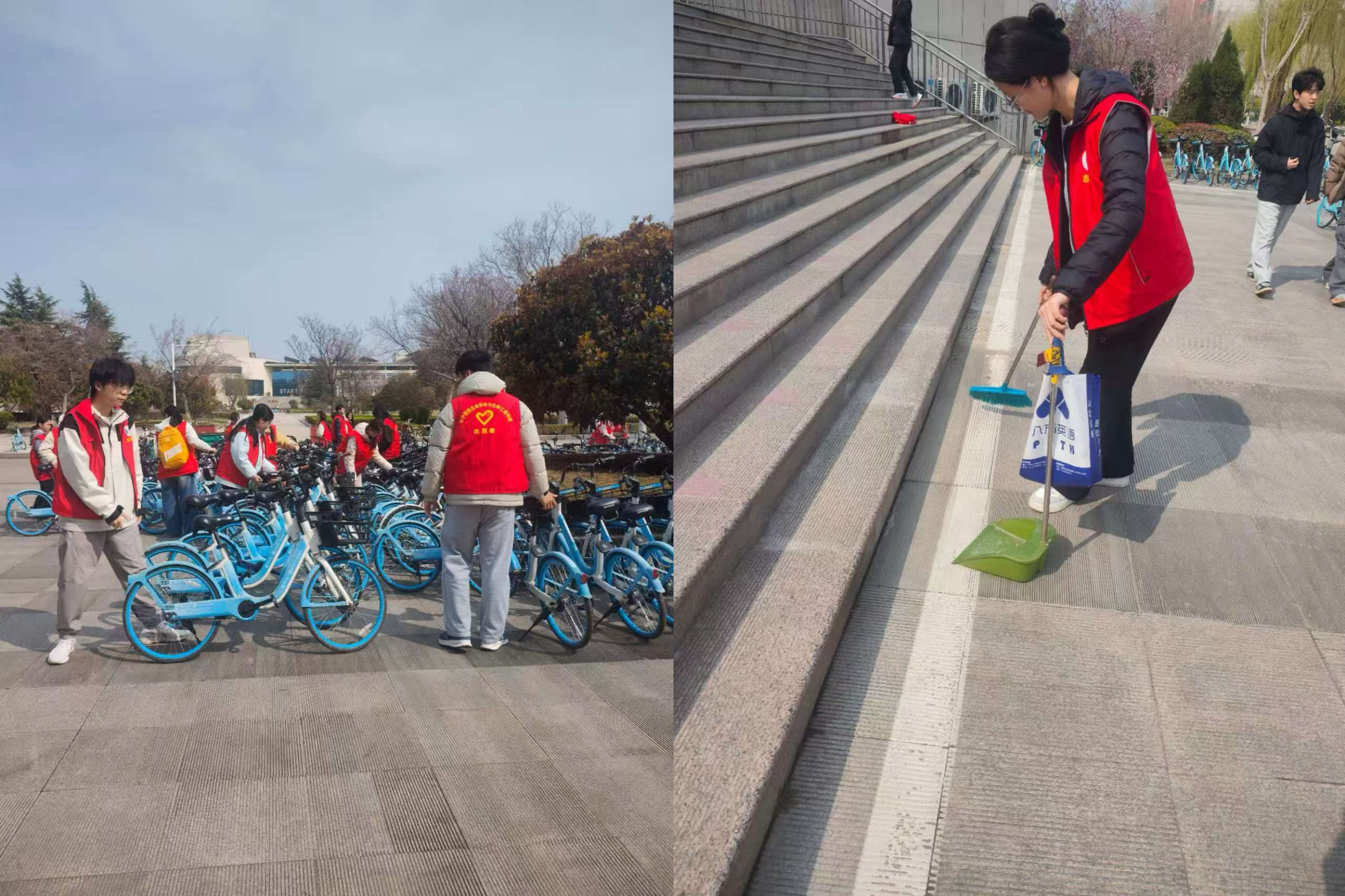 在理论学习筑牢思想根基的基础上,同学们组成志愿服务队,先后走进7号实验楼、9号教学楼及周边区域,开展“学雷锋 净校园”志愿服务活动。志愿者们身着统一服装,手持扫帚、垃圾夹、抹布、垃圾袋等工具,分工明确、协作有序,对教学楼、绿化带、宣传栏、楼梯等区域死角进行垃圾清理,铲除粘贴痕迹,擦拭扶手;在校园自行车停放区域,志愿者们耐心细致地规整乱停乱放的自行车,并对前来停车的同学进行文明引导,切实维护了整洁舒适的教学环境,保障了校园通道的畅通有序。